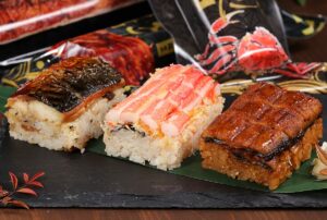 イベント内容(甲羅組):かに汁の無料提供・甲羅組押し寿司(かに棒寿司・焼き鯖寿司・うなぎ棒寿司)の販売
